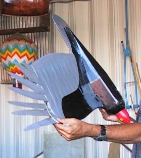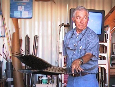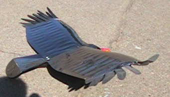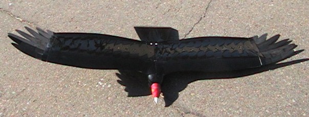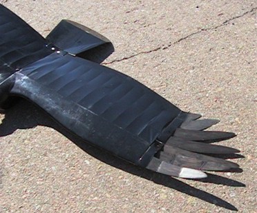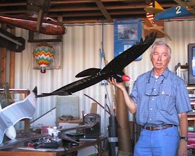Here is Bob holding up the Turkey Vulture model. You can see that it includes a nose section simulating that of a vulture's head to add to the realism, which may be one of the reasons the ravens weren't afraid to fly around with it. After some initial tweaking of the tip feathers and wing, this has become a good flying model. |