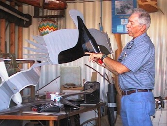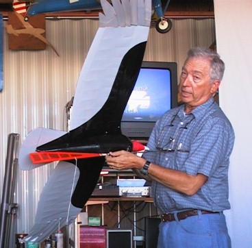 Below, Bob is showing how the high start stabilizing fin is installed in a slot in the bottom of the body. When the tow line disconnects, it also pulls the fin out of the slot so the model becomes tailless again. This fin was found necessary to prevent oscillations on tow that couldn't be controlled with the available aileron authority. |