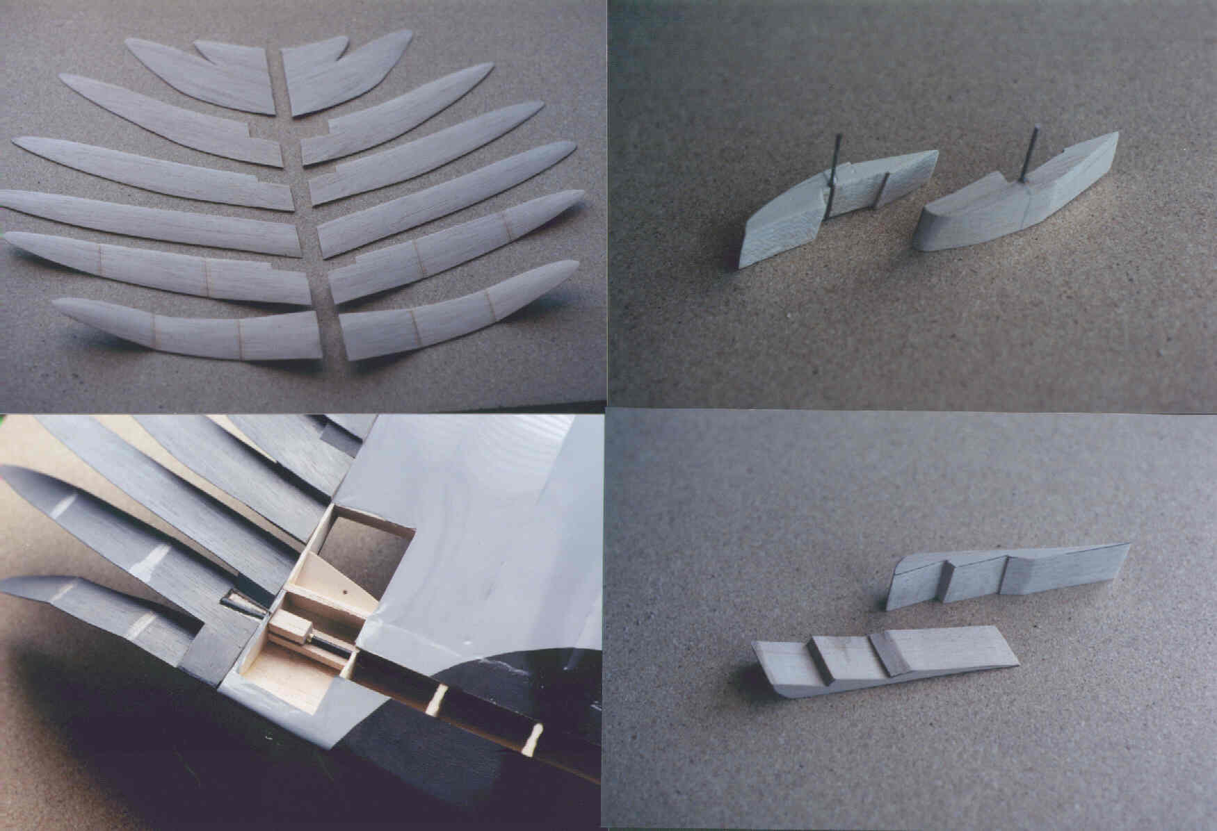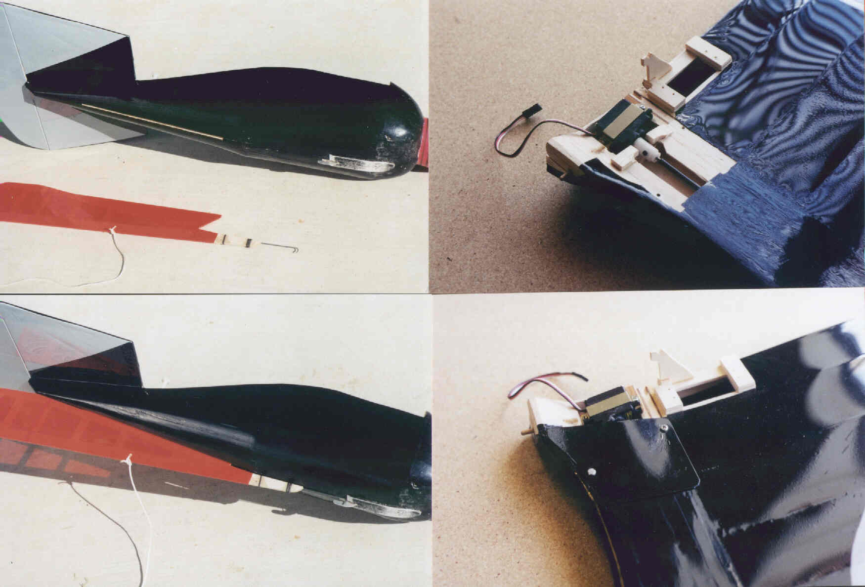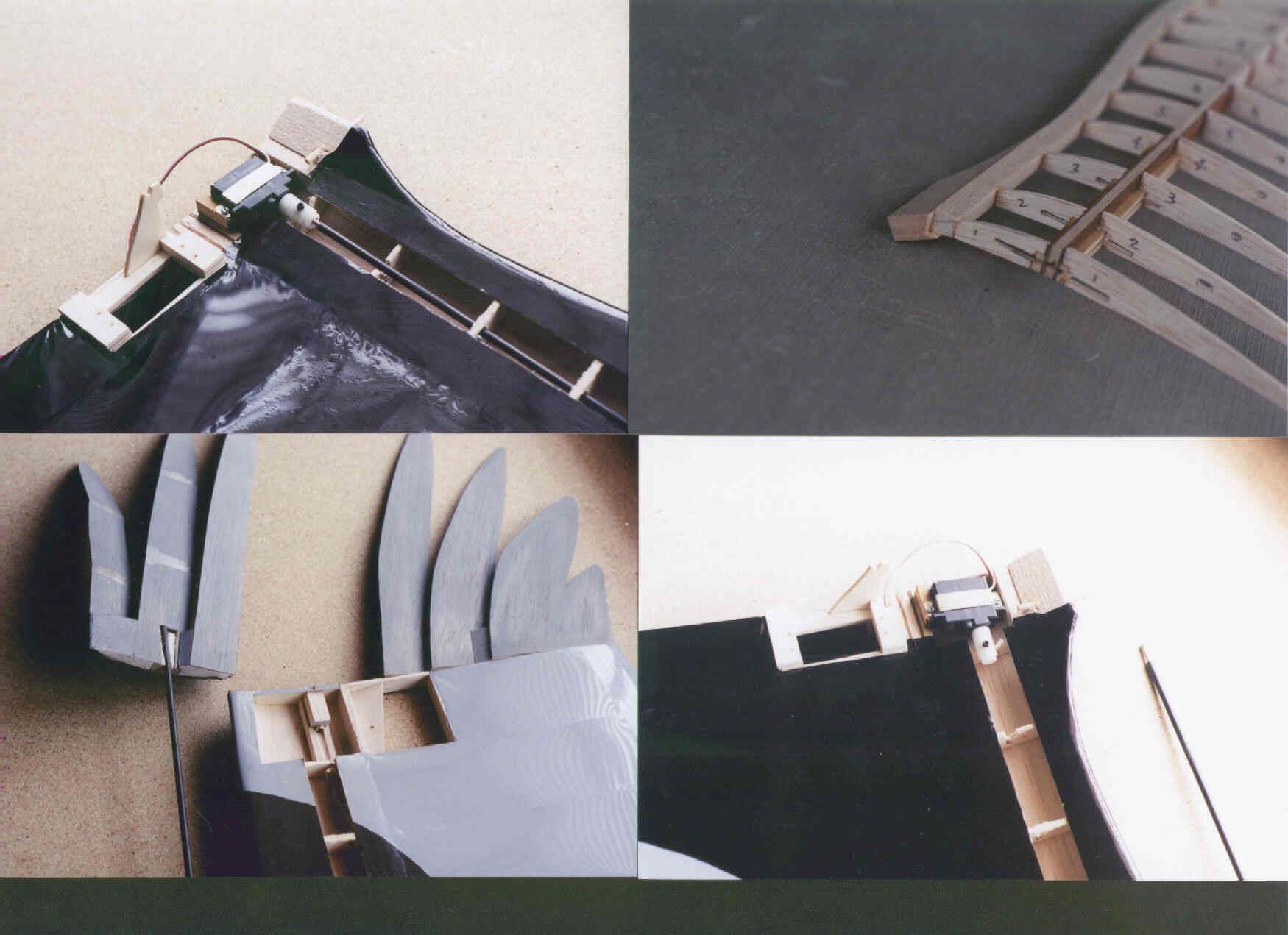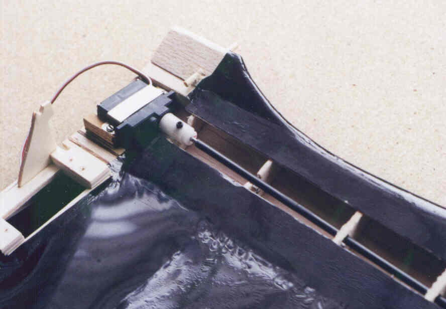Below is another shot of the tip feather configuration showing the lengths of each one as they progress towards the rear. Below right, you can see the elevator deflection. This is a two-channel model, although there is a channel used for mixing the ability to adjust the aileron's trim position simultaneously. This was one of the ways they found the optimum angle for the feathers. |
