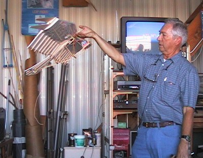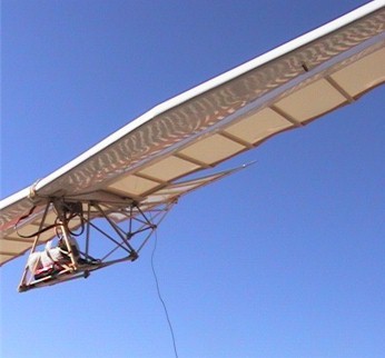 Below left, you can see the aileron is up, which was the result of the radio mixer function allowing both ailerons to move in the same direction for trimming. This is on way they were able to find the "sweet spot" tip angle for each model. It was found to be pitch sensitive, but once Bob learned to just use the ailerons, it became much easier to handle. The lower front crossbar have a tendency to make it dig in on landings. |