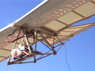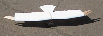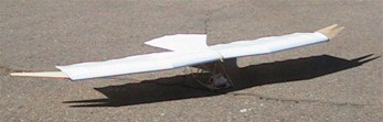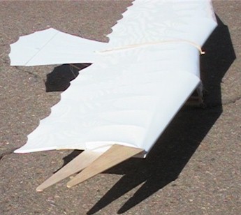 As you can see, this model only used two tip feathers for ailerons. They are set at - 27 degress for the first one and - 19 degrees for the second, as with the other models. The model is stable in flight, but they are still experimenting with it. There didn't appear to be any plans for building a full size version and taking it off a hill. |