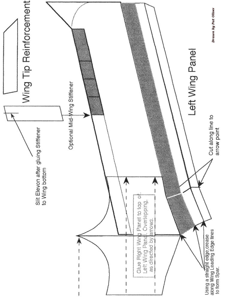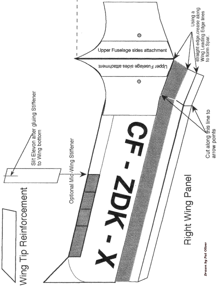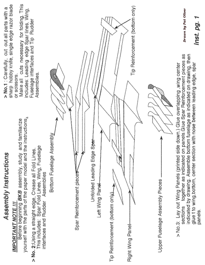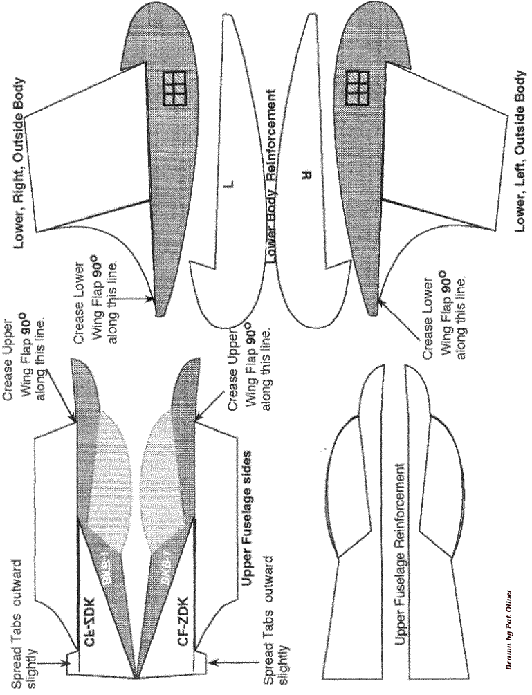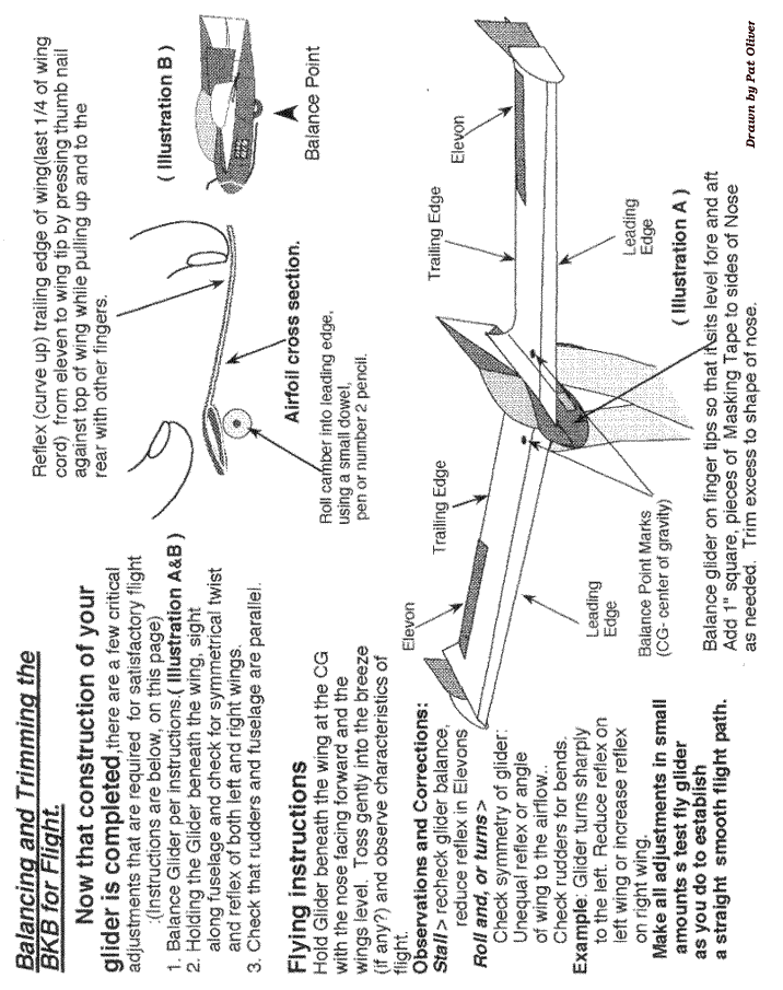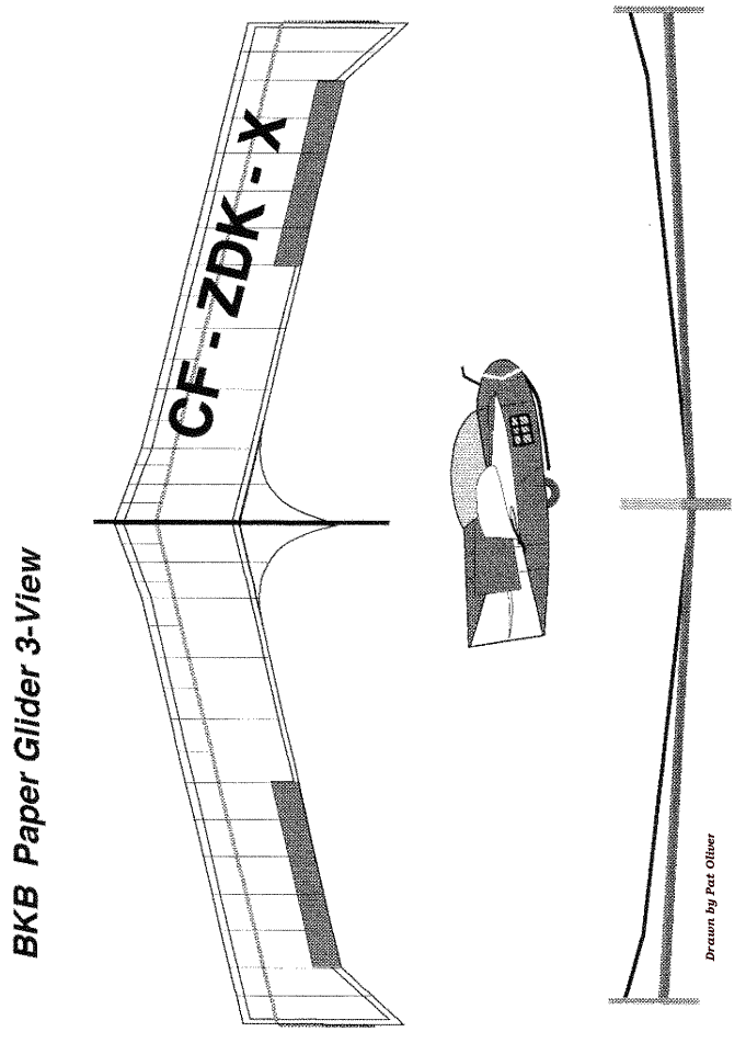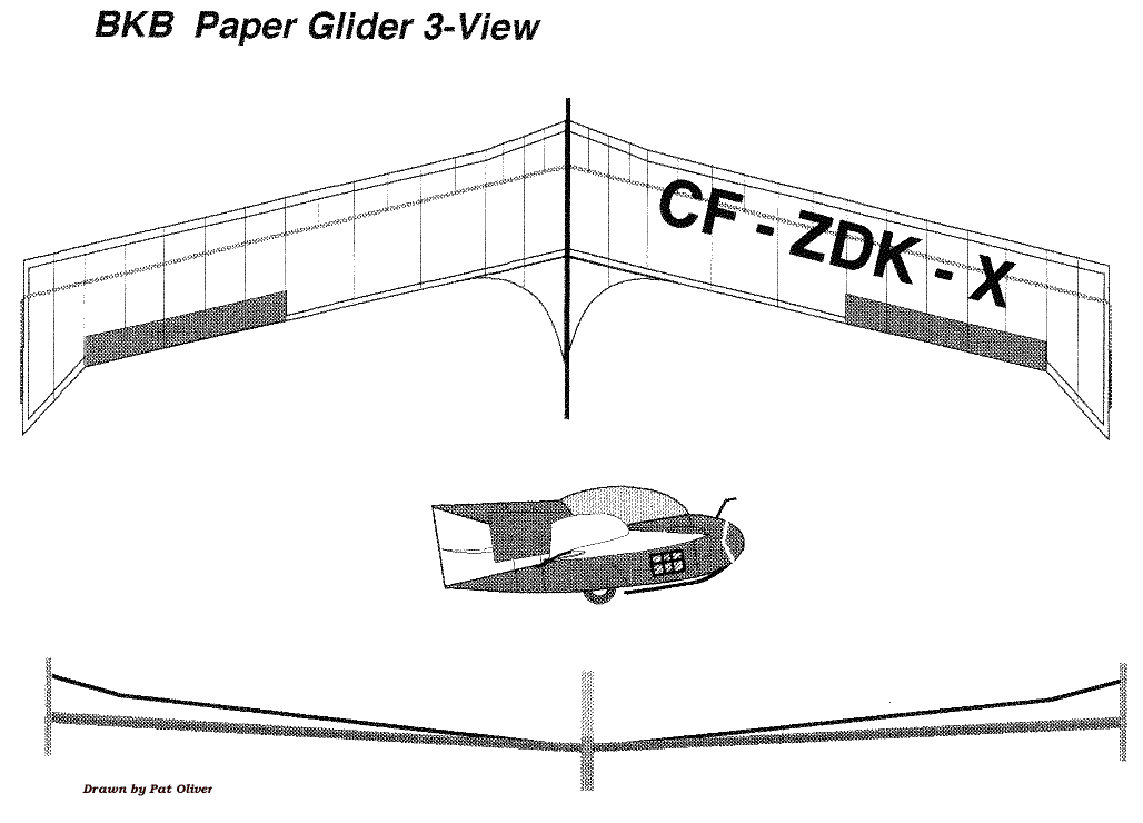 The BKB was an experimental design inspired by the Horten sailplane, and was created to serve a specific need in Canadian gliding in the 50's. It was a high performance, tailless aircraft with a glide ratio of 29:1, despite having a low aspect ratio of 10:1. It was most famous for its ability to perform controlled tumbles and recover; not exactly what it was designed for, but perhaps a serendipitous quirk due to its unique stability. This glider was designed with the following objectives: to fill a gap in Eastern Ontario soaring by providing a very stable tailless design that was inexpensive to build, easy to handle in flight, and, easy to maintain. In 1954 the partnership was formed, each member with his specific duties. Bodek and Kasper were to finance much of the project, Stefan to provide design and drawings and create the type record, while Bodek was to provide the excellent illustrations of the mechanical control systems and to collaborate on the design of the craft’s mechanical features. All three were involved in the construction which started in 1955 in Kasper’s basement. After Kasper left the project in late '56 and Bodek in '60, Dave Webb, David Marsden, Hiller Kurlents, George Adams, and Stan Rys assisted in modifications and/or testing. After 1963, it was flown extensively in the USA by Kasper at which time he added the triangular trailing edge tip extension seen in the paper model. Pat has provided us with the means for you to recreate this historic glider in the form of a paper glider that you can fly in your home, hanger, gymnasium, suitable indoor facility or in very light breezes outdoors. It is simple to build, even though it seems to have lots of parts, and performs well when properly trimmed. Clicking on pages 1-5 below will open the full size figure providing the building instructions that can be printed out on regular paper. Pages 6-9 should be printed on light card stock or stiff construction paper in order to give the glider the necessary stiffness. You can experiment with different weights and colors of paper and have contests. The original glider was black and white as seen in the picture of the early prototype above. A glue stick might be the best method of putting the pieces together, but use whatever method you have found successful in similar paper projects. Make sure to dry fit things like the wing stiffeners and fuselage parts before gluing and make any minor adjustments necessary for a good fit. We suggest you go into page setup and adjust your all your browser margins the minimum settings to get the figures to print on a single page. Also disengage the header and footer settings so only the figure prints. This allows for the maximum size of the glider which should be about an 8" half-span. Print testing was done with an HP Deskjet printer, so yours may require other adjustments. If you have trouble printing directly from the web page, save each of the four construction images and make the necessary changes in size to run on your printer. Just make sure that all images are adjusted the same amount so everything stays in the correct proportions. We would appreciate your feedback on how your construction went, how the glider flew and if you used it in a student environment. Drop us a short note at: twitt@pobox.com. |