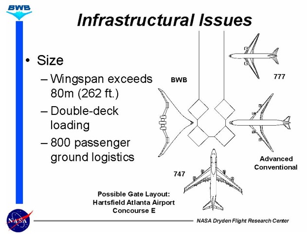 747s side-by-side at current passenger terminal gates, but the BWB’s 290’