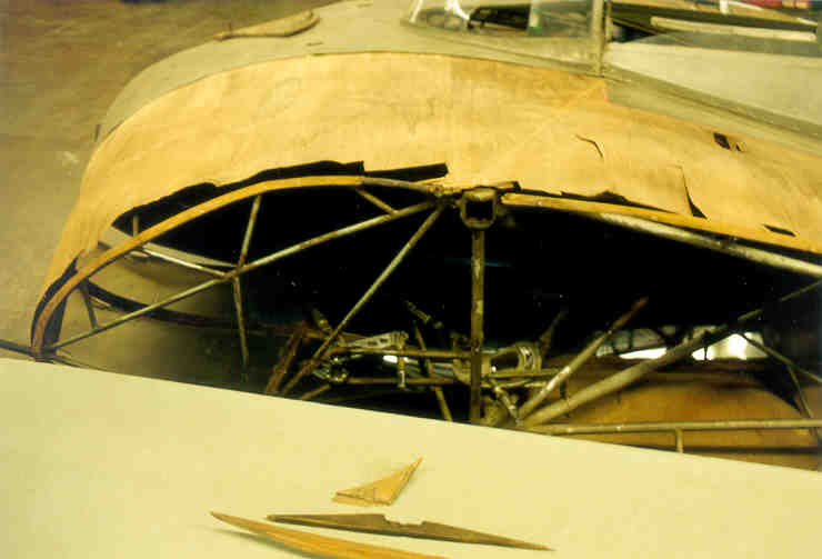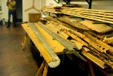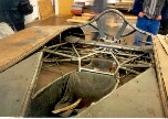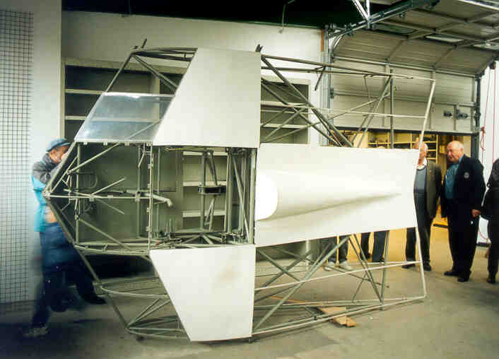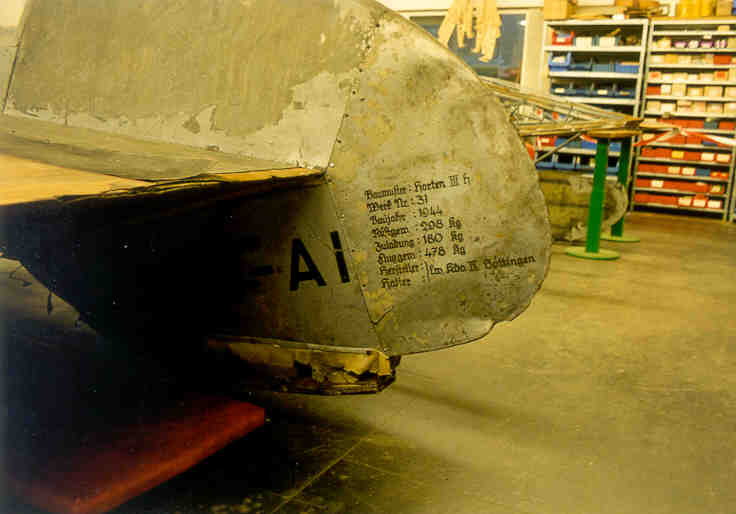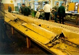 video of a test flight of the original Ho II. The Horten Ho IIL is in good condition. The central section is now in its rebuilding phase and the wings just need to be covered with fabric. On the right side of the central section photo, you can see Mr. Chris Wills of the Vintage Glider Club. He is also the son of Mr. Wills who was involved in the British evaluation team just after W.W.II. |