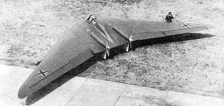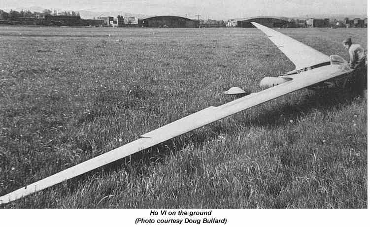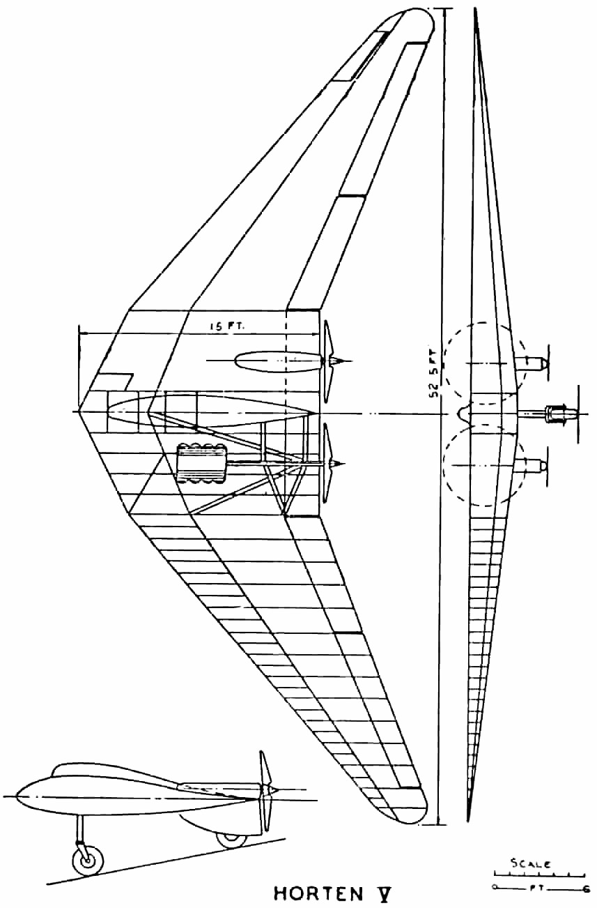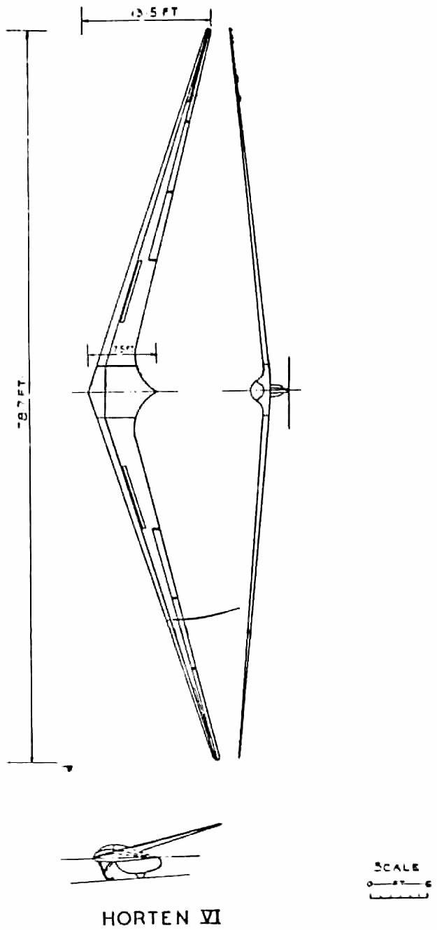Aerodynamic Design Outer wing panels were of the same aerodynamic shape as those of the H V. At the center line the section was 16% thick with 1.8% camber (zero Cmo) graded to 8% symmetrical tip sections. Wing twist was 5 degrees; 2 degrees linearly and 3 degrees parabolically distributed. The aircraft trimmed with elevons neutral at 260 kph (CL = 0.16). Performance The following performance data were quoted by Reimar Horten from memory: Flying weight (minimum)