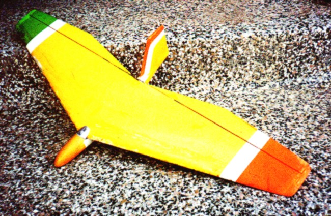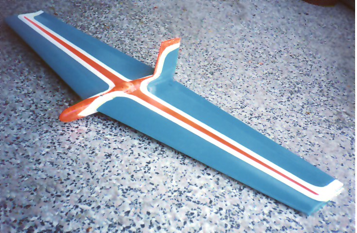This almost a plank. It has 11 degrees of sweep waith an EH 2-10 airfoil and no twist. Control is with elevons, span of 48", root chord of 12", tip chord of 8". It has good slow speed flight characteristics and a top speed of about 50-60 mph. |