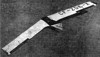 The ailerons were made to continue the wing aerofoil section including the reflexed trailing edge. This acted as a fixed trim tab which gave a rather unpleasant nose down stick force which could not be trimmed out. Flight tests were continued without correcting this condition as time before the end of’ the season was limited and more flight data would be a useful basis for changes. Elevator control was sensitive with almost instantaneous response, a characteristic of the tailless configuration due to low pitching moment of inertia and low aerodynamic damping in pitch.