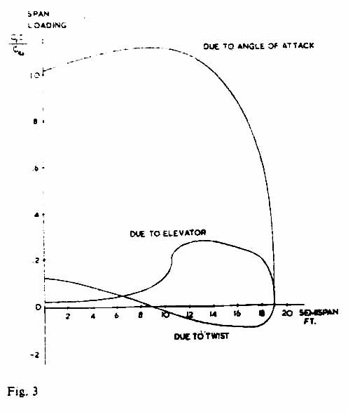 It is known that twist incorporated in a straight wing, properly tapered for optimum drag. is generally harmful. It so happens that twist, necessary here, to augment the positive pitching moment, actually improved the properties of the chosen planform. This wing should be twisted to give, at a chosen incidence, elliptical load distribution and associated minimum induced drag for a given aspect ratio. Additional correction is necessary, of course, to maintain this type of distribution throughout the speed range. This correction comes automatically from the deflection of the elevators necessary for trimmed flight at speeds below or above that corresponding to incidence at which the glider is trimmed with the elevators neutral. There is another type of loading, resulting from wing aeroelastic deflection. This however is considered negligible in view of the high structural stiffness of this wing. Thus we have spanwise lift distribution only due to angle of attack, twist, and elevator deflection.
