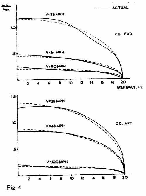 It can be seen that the spanwise distribution of lift, here identical with the distribution of lift coefficient since c/C av = 1,0 ( fig. 4), gives the desirable center section wing stall, since thelift coefficient decreases towards the tips.