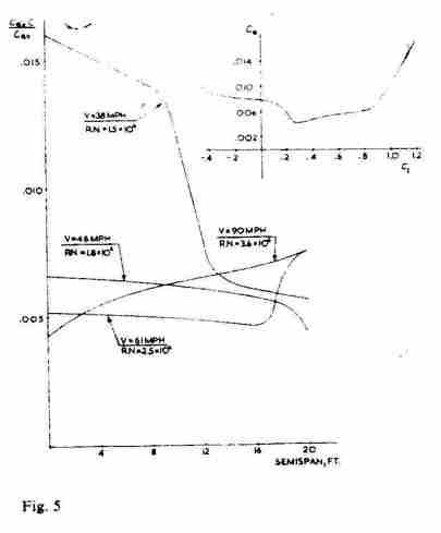 There is a penalty however in the related profile drag. At low speed, the center part of the wing reacheshigh local values of the lift coefficient with the associated higher profile drag (fig. 5). More judicious selection of airfoils along the span would improve the situation.
