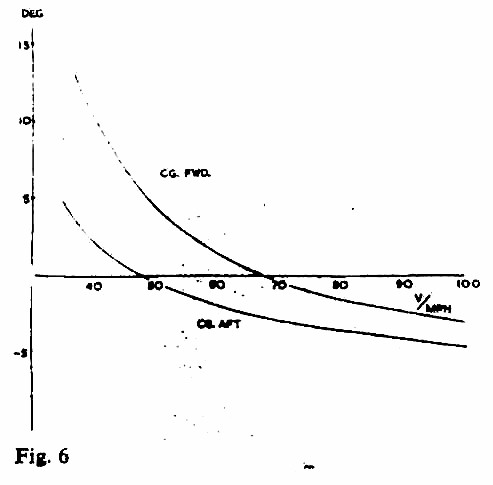 Longitudinal StabilityAs it was mentioned before, configuration yields a positive moment (nose up) which permits the centre of gravity to be located forward of the aerodynamic centre. The degree of longitudinal stability may be varied by c.g. shift. The fortunate feature of this sailplane is that the pilot’s position coincides with the centre of gravity of the empty glider located within the desirablelimits.The variations of pilot’s weight will thus have very small influence on the degree of stability. Elevator deflection to trim is shown on fig. 6.