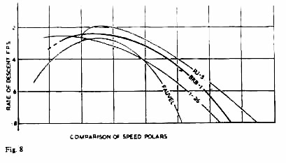 Fittings are of the simplest type, designed to be made out of steel plates and light alloy extrusions with the help of band saw and drill press. In order to preserve the feel of controls and eliminate dead motion, ball bearings are used for all movable connections. The prototype is equipped with small dual wheels. They are mounted on the skid and protrude 1 inch below it. Estimated performance data are given in fig. 7 and compared with some other sailplanes in fig. 8.