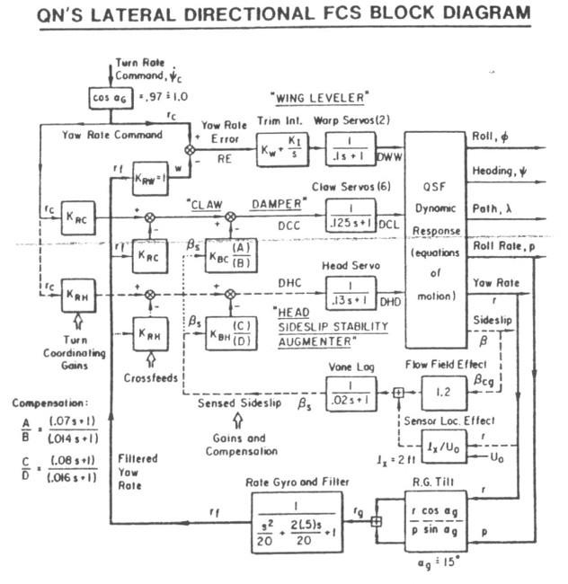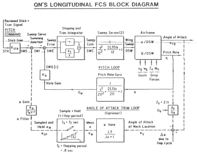 Using “claw-dampers”, in lieu of yaw-dampers;AeroVironment showed that proper twisting of the wing as it flapped, plus a much more sophisticated airfoil, used together, could provide the necessary propulsive efficiency to achieve level flight with less than 1hp (746W). With these obstacles overcome, it was decided to build a half-scale replica having a span of 18ft and target weight of 30 lbs to make construction and handling easier while still resolving the scientific issues. One result of the workshop is shown in paleontology – artist Greg Paul’s rendition of the flight worthy QN. Its modern soaring-bird like appearance should not surprise us; after all, the QN’s Program Manager had over 100 million years to refine its design! A very important result of the blending of various disciplines at the workshop was a new interpretation of the wing airfoil and structure. Based on fossil evidence of smaller pterodactyls, from French caves, it seems that their airfoil was not just a bat-like membrane, as often depicted. Our new interpretation is that the finger bone was the leading edge of a double-surfaced membrane, with chordwise flexible cartilaginous “ribs”, the precursors of feather shafts. The leading-edge muscles were ahead of a “lazy-T” shaped spar, and when they contracted for downward or upward motion, they gave appropriate leading-edge camber, downward or upward, respectively. It also became apparent that the slab-sided head, with sharp edges and a aft crest, was not just cosmetic. Its resemblance to the strake-wing of an SR-71 “Blackbird” supersonic aircraft was compelling evidence that it was used as a forward steering rudder capable of sustaining large angles of sideslip without stalling. This is just what is needed for a canard rudder. Henry showed analytically that if the QN actively pointed its head where it wanted to go, then the head’s deflection with respect to the neutrally-stable wing/body/feet combination, would stabilize the ensemble. However, it would have to remain unstalled over a large local sideslip range. Professor Langston returned to Texas and found that the QN’s head-neck joint was a ball-joint with large deflections possible – a good example of theory guiding and interpreting 100 million-year-old data! Another feature of the QN fossils is their prominent claws. After watching seagulls soar, we noticed that they used their upper tip feathers as one-sided drag “spoilers”, to produce effective yawing moments. Hence, we proposed to use the QN’s claws actively opening upward to give damping – in yaw, i.e., as “claw dampers”. The use of fore-aft motion of the wing to trim hang gliders is well known, but birds also stabilize their neutral pitch stability by more active sweep control, so this was used on the QN. The more we studied QN the more sophisticated and clever its detailed features became. The project adopted a policy that the QN replica should, whenever possible, use means similar to the original pterodactyls to help answer numerous scientific questions about feasibility of their flight performance and control. It is interesting to compare the means for achieving automatic flight control for: a) stability – inner-loop regulation against disturbance due to gusts, wing-flapping – sweeping and, -twisting, wing asymmetric lift and thrust due to imperfections in construction, and; b) path-control – outer-loop following of guidance commands for airspeed (trim, average angle-of-attack), rate-of-climb/descent, and (gently) banked turns. Following the feasibility workshop in 1984, the foregoing stability and control concepts were evolved and analyzed, and the schemes noted above were given priority. Several areas of high risk, due to lack of prior data or validated theory, had to be researched and developed before the detailed design could be defined. These risk areas were tackled independently, focusing methodically on one at a time to minimize the compounding of R&D problems in any one experiment. In the flight dynamics arena there were: control of pitch trim by active wing sweep; pitch stabilization against the wing’s flapping moments; lateral control by head deflection, and; claw damping and launching techniques. Inside the QN there were uncertainties of the power train design, wherein light-weight versus low friction was in conflict. The use of samarium cobalt electric position servos for primary power was novel, as was the combined wing flapping and sweeping mechanism. The wing construction, to enable it to be stiff in bending but limber in twist, was a structural challenge. The first problem to be solved was the stabilization and trim in pitch by means of active control wing sweep. Testing these nonlinear radio-controlled model aircraft servos with the wing attached was a story in itself. They used “frequency sweep” inputs and a video camera record of the command and response motions, to yield surprisingly good Bode plots. The first test glider was an R/C model sailplane of conventional design with a span of 8 ft and a weight of 6 lbs. It had an angle-of-attack (AOA) vane at the top of the vertical tail, which sensed the tail’s local AOA, including wing downwash. This was fed back to the wing sweep servo to sweep the wings forward (nose up) if the AOA decreased, and vice-versa. As the gain of this feedback loop was optimized, the horizontal tail tips were progressively cut away, so that there finally remained only a 4 inch stub, such that the wing-body was statically unstable. It was an eerie sight to see this tailless glider soaring in the hill-induced upwinds, with its wings hesitantly hunting fore-and-aft as random gusts disturbed its equilibrium. The experiment proved the principle of obtaining pitch stability by active sweep control, they think was the first time in an aircraft. It remained to change the sensed feedback from tail AOA to body pitch angle and rate to resist the large pitching disturbances d