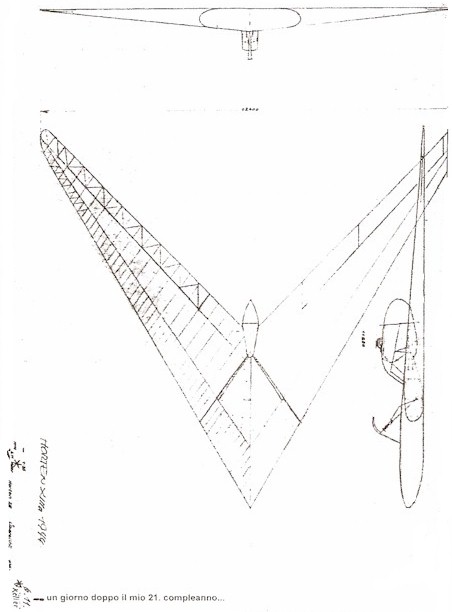 Schaden (Nov 2008 issue). .....It is taken from a recently published book. See bottom of page. It has been written by my friend Giorgio Evangelisti, who is also a lifetime friend of Richard Keller. .....Keller is now living at Arco, near Trento, on the Eastern Italian Alps. He was born on 5 November 1923 at Augsburg (Bavaria) and started his aeronautical career by building plenty of free flight tailless models. No radio gear was available in those days. While testing his models in a field near his home, he was noticed and contacted by the (then middle aged) professor Alexander Lippisch. This extremely valid researcher, a Messerschmitt employee, was experimenting with his model airplanes side by side with the young Keller. .....Lippisch so was impressed by the innovative shapes of Keller's flying models that hired him as his assistant and collaborator. Computers and CAD did not exist yet, but the young Keller had developed an extraordinary capability for tracing three-dimensional drawings of aero planes, which existed only as blue prints. Starting from the ME 163, Keller designed in 1942 a two-reactor interceptor. (Image 1) The drawing that he made of this aero plane was so realistic, that Hermann Goering took it as true photography, and asked Lippisch and Keller whether they had already built it. .....When Lippisch and Messerschmitt parted company, Keller was transferred to the Horten Sonder Kommando. (Image 2) .....In this new position Keller was very instrumental in designing the Horten H-XIII-a delta plane, the first one with a 60° sweep. (Image 3) .....The relevant drawing was made by Keller on November 6, 1944, his 21st birthday. The plane was test-towed in the air, like a sailplane, on November 27, 1944 !!!!! Everything went fine, exactly as expected. A curiosity: for this project Keller had available a long horizontal drawing board (15 meter by 2). Keller's first job with the Horten team was the set of aerodynamic calculations for the H-IX-V1. After the war, Keller could not emigrate in America, as requested by Reimar Horten, because he had suffered TBC. .....Drawings and technical reports by Keller, which had been given in custody to a friendly family, were burned in order to prevent American soldiers to seize them. Another curiosity: when employed by the Messerschmitt firm at Augsburg, the young Keller had the opportunity of drawing the image of a two reactor plane with enormous auxiliary fuel tanks. (Image 4) .....Only later he learned that it was piloted by Rudolph Hess, in his historic escape to England. .....Very little remains of the Keller's advanced work: a two-reactor pursuit plane; a rocket interceptor (1942), designed upon request by Lippisch. (Images 5 & 6) Ferdi Gale PS: EROI DEL CIELO (Heroes
