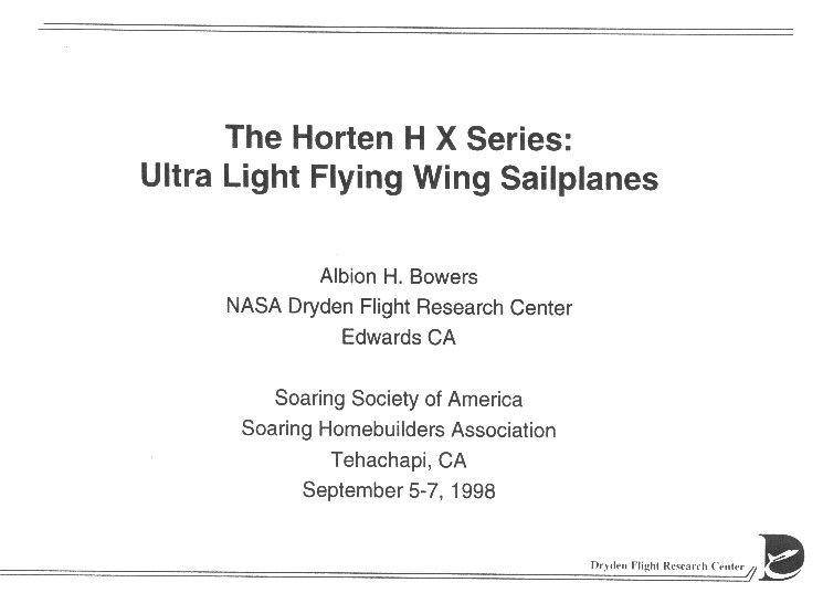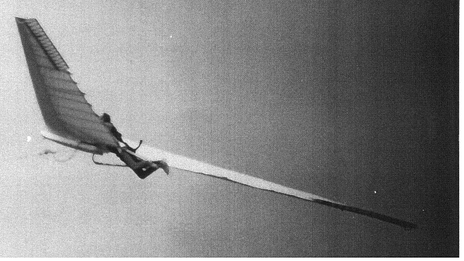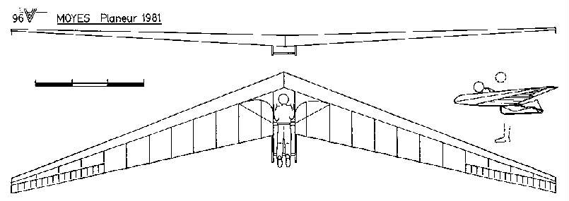 Per Philippe Vigneron, an Australia Gliding article in the August '91 issue offered the following: 'It appears that two German modellers had corresponded with Reimar Horten and had built a model Horten wing, then won a world championship with it. This apparently pleased Horten to the extent that he offered them drawings of his latest design, the Piernifero 3. The two modellers could not make use of them so Bill Moyes offered to finance the construction of a prototype. How Bill met the modellers is not clear. He paid the modeller's fares to Australia where they spet six months in his hang glider factory building the Horten.' Al Bowers has been in contact with Bill Moyes about his project and has indicated there may be more information to come on this project which could enhance Al's attempts to finish his analysis of the H Xc. (Bottom: Philippe's rendering based on Moyes' information.) |