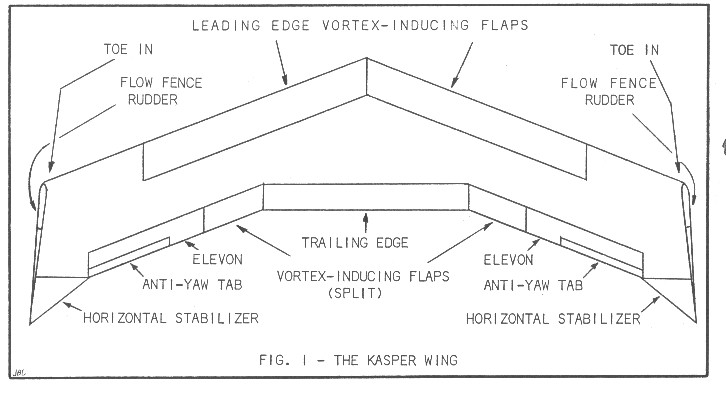In another test flight he decided to try making it tumble forward by putting a 10 lb. weight in the nose to move the CG. Unfortunately, in the BKB-1 this also shifted the center point of the other axes and he ended up having a rotation point at about his hips. This caused him to have the extra g-forces on both his upper and lower body and, he commented after the experience that he felt a little taller. The other unusual thing about the BKB-1 was the way in which on the controls worked. Kasper knew how to fly it and without having a 2-place version could only tell other pilots about the use of the control surfaces. The only times the glider crashed was when others were flying it. Contrary to a conventional glider, the BKB-1's controls couldn't be neutralized after making the initial input, but rather they had to be left in the desired position to prevent the glider's natural stability (the drogue/cone effect noted earlier) from returning it to straight and level flight. This was disconcerting to many pilots and they would end up in a PIO situation and claim the aircraft couldn't be flown properly. Another part of the positive stability was provided by the 4 degrees of toe-in on the end plates. It has good pitch stability since the wing is built flat and the airfoil doesn't have washout in the traditional sense. In order to achieve the affect of washout, he put a non-moving stabilizer at the trailing edge of the wing tip at an angle to create reflex on a wing with 4 degrees of incidence. The airfoil is a Wortmann from a helicopter blade and he was able to make them work with this new reflex stabilizer at the tips. Kasper later took this one step further with the BKB-N where he installed his vertical spoilers on the end plates. (Click here to details of the spoiler/rudder configuration.) These were not meant to control the L/D, but rather to make the aircraft turn. With movement of the balance tap towards the inboard area, it causes a loss of lift over the stabilizer tap and the elevons, which are also mounted closer to the wing tip than in other flying wings. The outboard movement of the rudder portion of the spoiler causes drag and helps turn the glider in that direction. Kasper found he could get a fully coordinated turn by just using the appropriate rudder pedal. These spoilers could also be used for glide path control by pushing on both pedals at the same time, which caused a pitch up mush mode. Just before reaching the touch down point on a landing, the pedals could be released and the glider would automatically flare for a normal landing and roll out. (Click here for another prespective of this setup.) The other thing Kasper discovered was that this combination of controls actually created triple redundancy, since any one of them would allow him to fly the aircraft. He also noted that you really didn't need an elevon with his system since the vertical spoilers, when combined with just an elevator placed out towards the tips, was enough to adequately control the glider. John apologized for not having the video tape of a Kasper wing actually tumbling in flight. However , he noted that the BKB-N was the first aircraft to be certified for a tumbling maneuver (this was in 1970). Kasper did many airshow demonstrations with the BKB-N and would finish with a tumble just before the landing. To accomplish this feat, he would come down the runway on his "downwind leg" at about 300' inverted. He would then initiate the tumble by pushing the stick forward then pulling back, allowing the tumble to last until about 50' where he would pull out it and land into the wind for a normal touch down. The FAA commented that he had to do a 180 degree turn at the end of the runway to prepare for landing, which he wasn't doing during these early airshows. Kasper solved the problem by just coming in lower and, on reaching the end of the runway would do just a half tumble (180 degree turn) into a landing. John related the story of how Kasper achieved his tumbling certification from the FAA. He did a touch-n-go at 80 mph right in front of the examiner then pulled up into a half loop of about 300' where he commenced the tumbles. First there was a half revolution backwards, then a half revolution forward followed by another half backward tumble. This left him in a position to accomplish a landing and roll out to put himself on the spot he originally hit on the touch and go. After such a display the FAA examiner had no choice but to issue a certificate. John showed a plan view of the BKB-1 that had some of the original dimensions. The span was 39', with about 155 sq. ft. of area, an aspect ratio of 10:1 and, an empty weight of 375 lbs. (although the plan view had this crossed out and a weight of 458 entered which may have been due to modifications or a heavy paint job). The next slide covered some of the material presented in one of Kasper's books on the Bekas aircraft. Kasper commented that the glider had a different behavior than other types he had flown and it required learning a new flying technique. It couldn't be stalled even at a high angle of attack like 40 degrees to the relative wind, since in this attitude it would go into the "mush mode". John said that the video his dad had showed a tuft test session where the airflow was actually coming back over the wing. Kasper noted that lateral, longitudinal and directional control were affective and solid at airspeeds as low as 15 mph even though the calculated stalling speed was 42 mph. It didn't have any dynamic stability, but showed an uncanny stability returning to the original position within half an oscillation when disturbed by a gust or pilot input. This was the results of Kasper designing in the drogue stability mentioned earlier. One of the more interesting comparisons made by Kasper was in relation to conventional aircraft. He said the a shift of the center of gravity causes a change in the static margin moment and it has to be compensated for by the ba