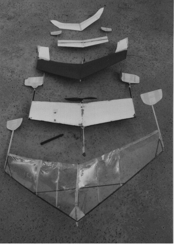 Paul wirtes: "The stabilized set in the up-region of the tip vortex have more authority than the same area behind the wing center. This is sometimes called "wisor tail" first developed as the BV-208.P3 aircraft designed by Dr. Ing. Richard Vogt during the latter half of WW II. The reference was sent to me by Phil Burgers. It's from Aeorspace Engineering, May 1996. "All of this connects to what Robert Hoey is doing on vulture controls, and Al Bowers on the Hortens and hat-shaped rather than elliptical lift distribution, and Karl Nickel on the same subject. "The rear-most glider is the "Walkalong" of my son Tyler. (ed. - you can slope soar this one by pusing it along in front of a small board or even your forehead.) "The second from largest model is electric powered and flies fine with 2.5 oz. gross weight. These studies are aimed at building a stable, controllable, slow flying model I'll call 'Housefly' to fly in a living room with a video camera." Submitted by: Paul MacCready |